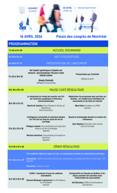 Après deux éditions retentissantes, RCCAQ innovation est fière de vous convier à la 3e édition du Sommet TeC, qui aura lieu au Palais des congrès de Montréal le 16 avril prochain. Une journée incontournable dédiée à l’innovation, aux transformations numériques et aux solutions qui transformeront le futur des cabinets de courtage en assurance de dommages.